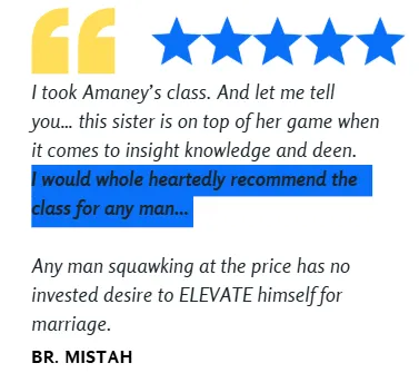 Every other week you will jump on a joint coaching session with sisters and discuss a crucial marriage topic (i.e. mahr, in-laws, gender roles, etc.) in a respectful environment.